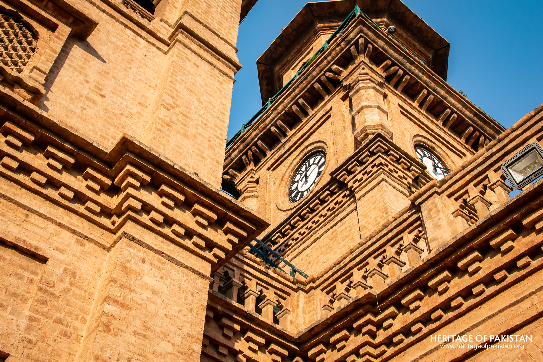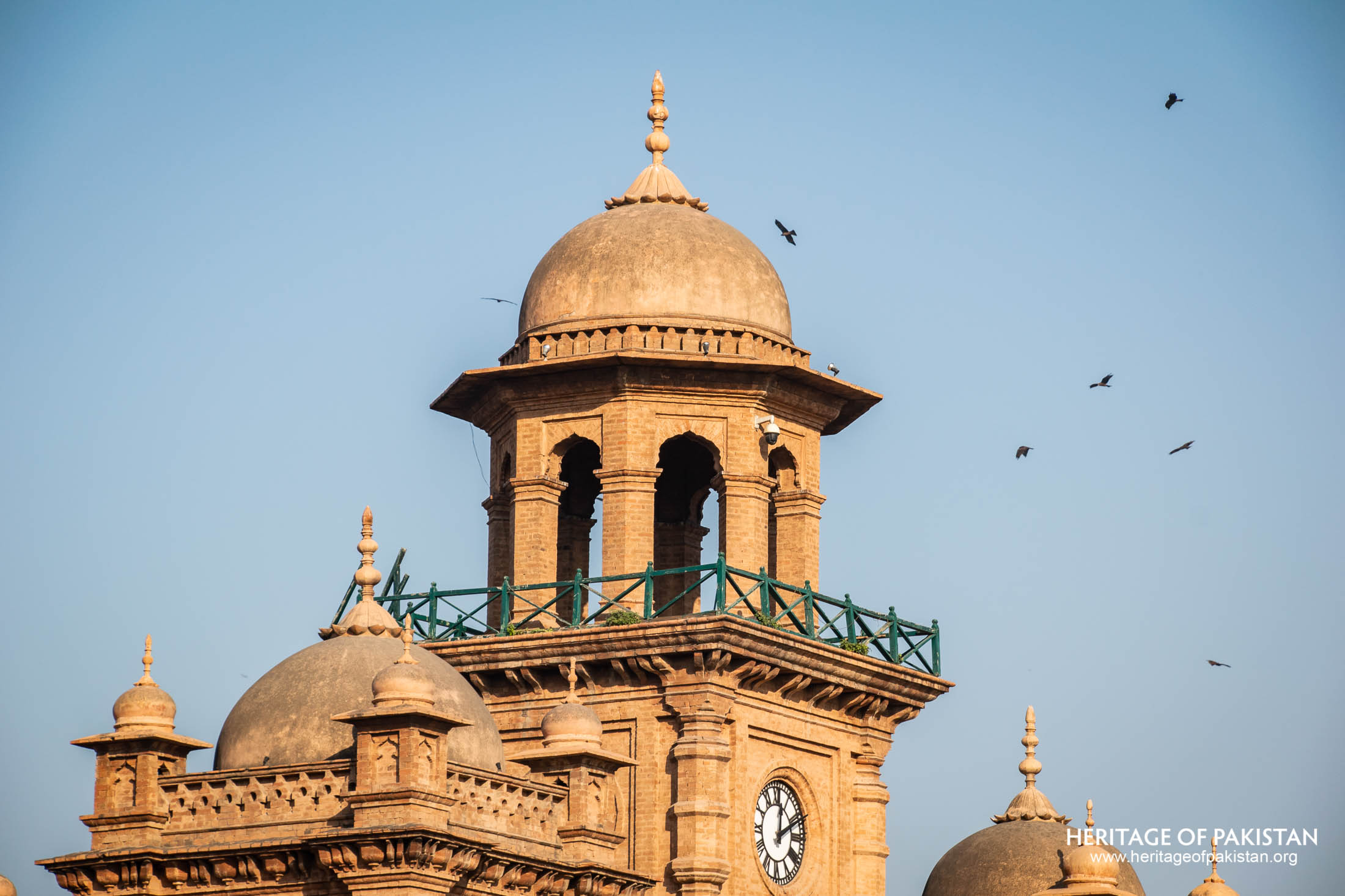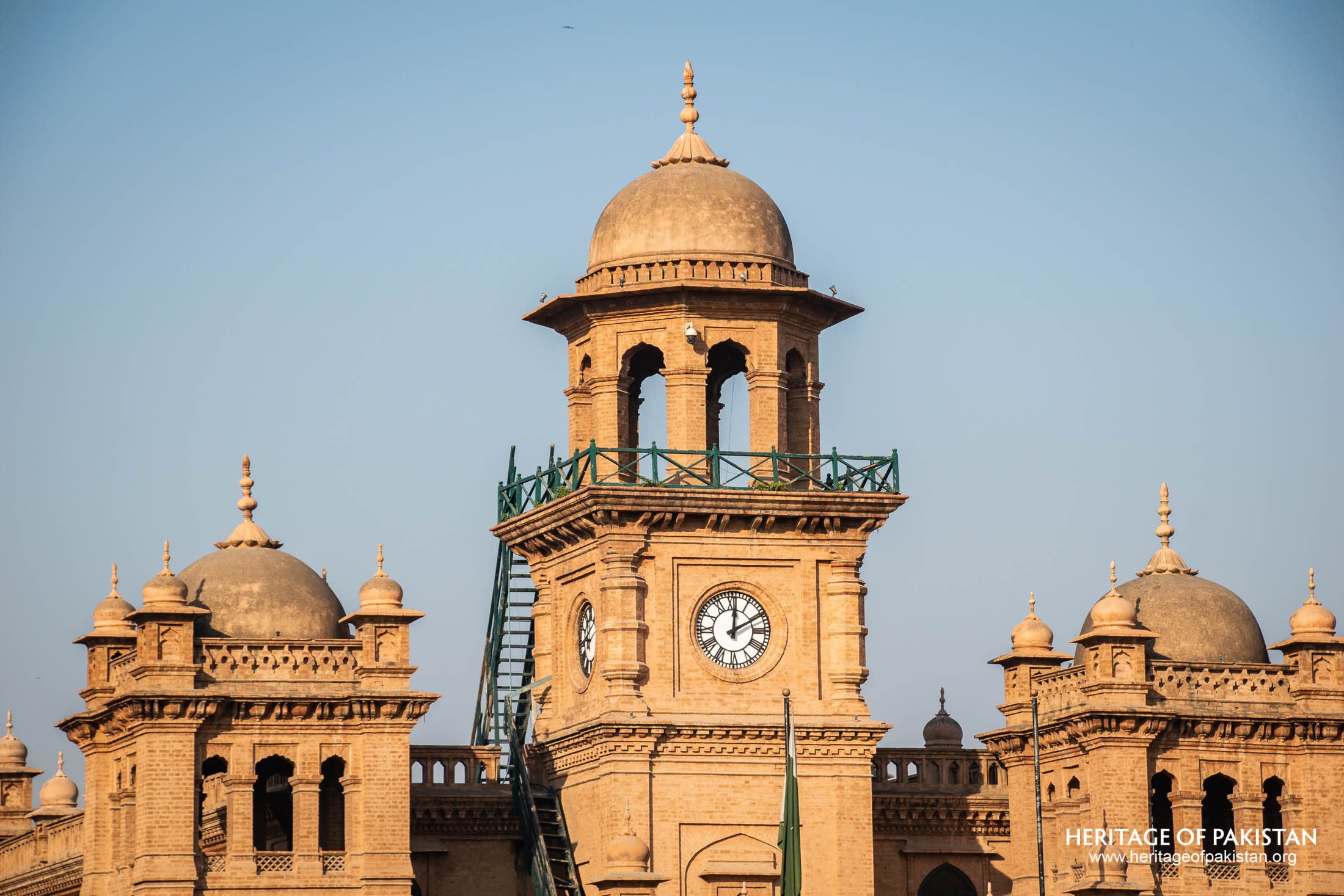 Its architecture is a notable example of Indo-Saracenic design, with a symmetrical layout, a tall central clock tower, domed chhatris, arched windows, jaalis, and Mughal-style turrets.