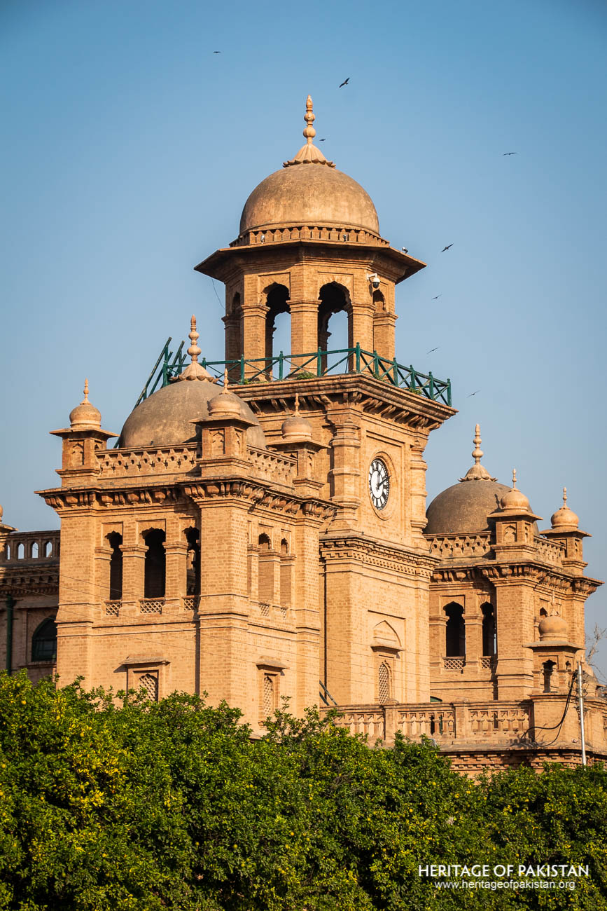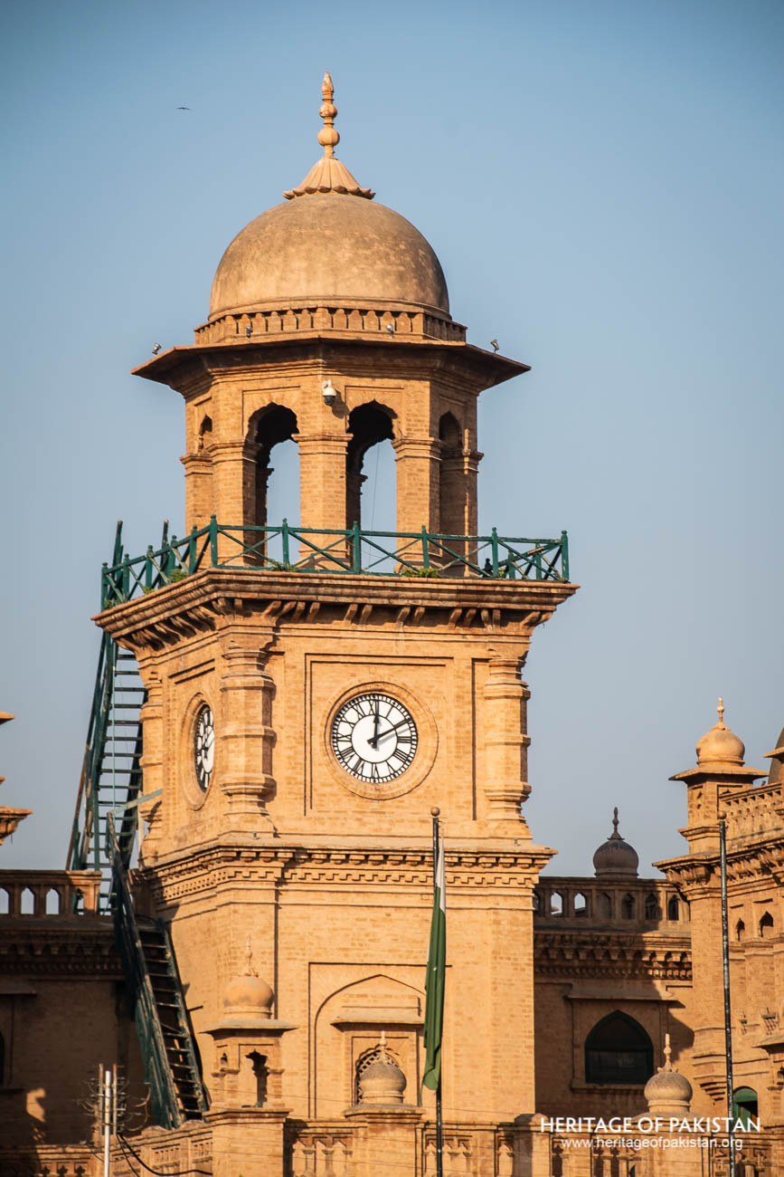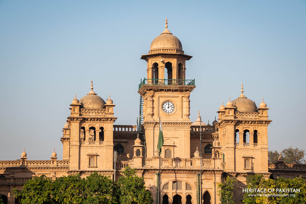 The main building of Islamia College is symmetrical in layout, with its most dominant visual element being a tall clock tower positioned centrally. At the base of this tower are four open chhatris—domed kiosks in the Mughal style—which add vertical emphasis to the composition. The building’s domes are bulbous in form and set atop drums, crowned with lotus-finial spires, recalling Mughal tomb architecture. Octagonal and square turrets emerge at the corners of the primary structure and its adjoining wings, invoking the image of Mughal minarets. These turrets are topped with small domes and are decorated with miniature columns and crenellated merlons, enhancing the skyline silhouette of the college.
