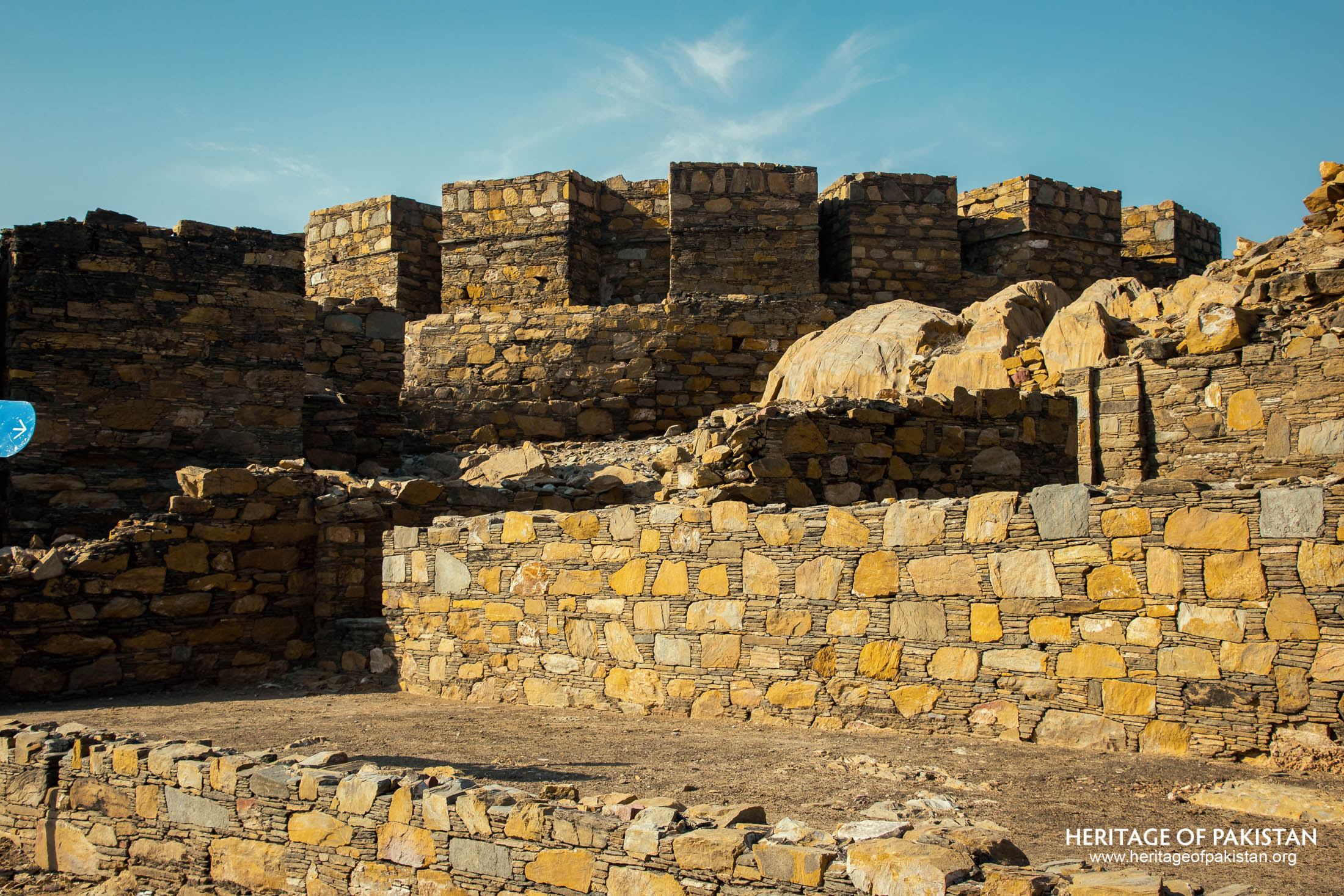 The monastic area lacks a formal plan and includes scattered quarters identified by Amina Tariq, as well as a main hall, kitchen, store, and refectory.