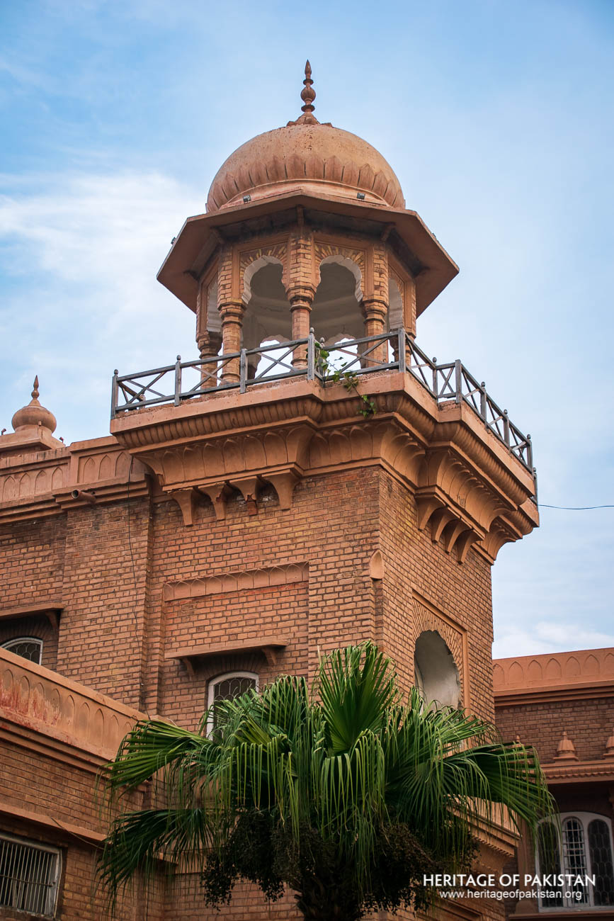 In its earliest configuration the structure rose two storeys and comprised a central main hall flanked by side aisles on both the ground and first floors. Four graceful cupolas crowned the roofline, and small pinnacles accented each corner, producing a balanced silhouette that blended British civic formality with Mughal vertical emphasis. Subsequent expansion respected this symmetry: in 1969–70 one additional hall was appended on each of the eastern and western elevations, mirroring the original fabric, and in 1974–75 a second storey was added above these new wings, retaining the vocabulary of arches, domes and red‑brick detailing.
